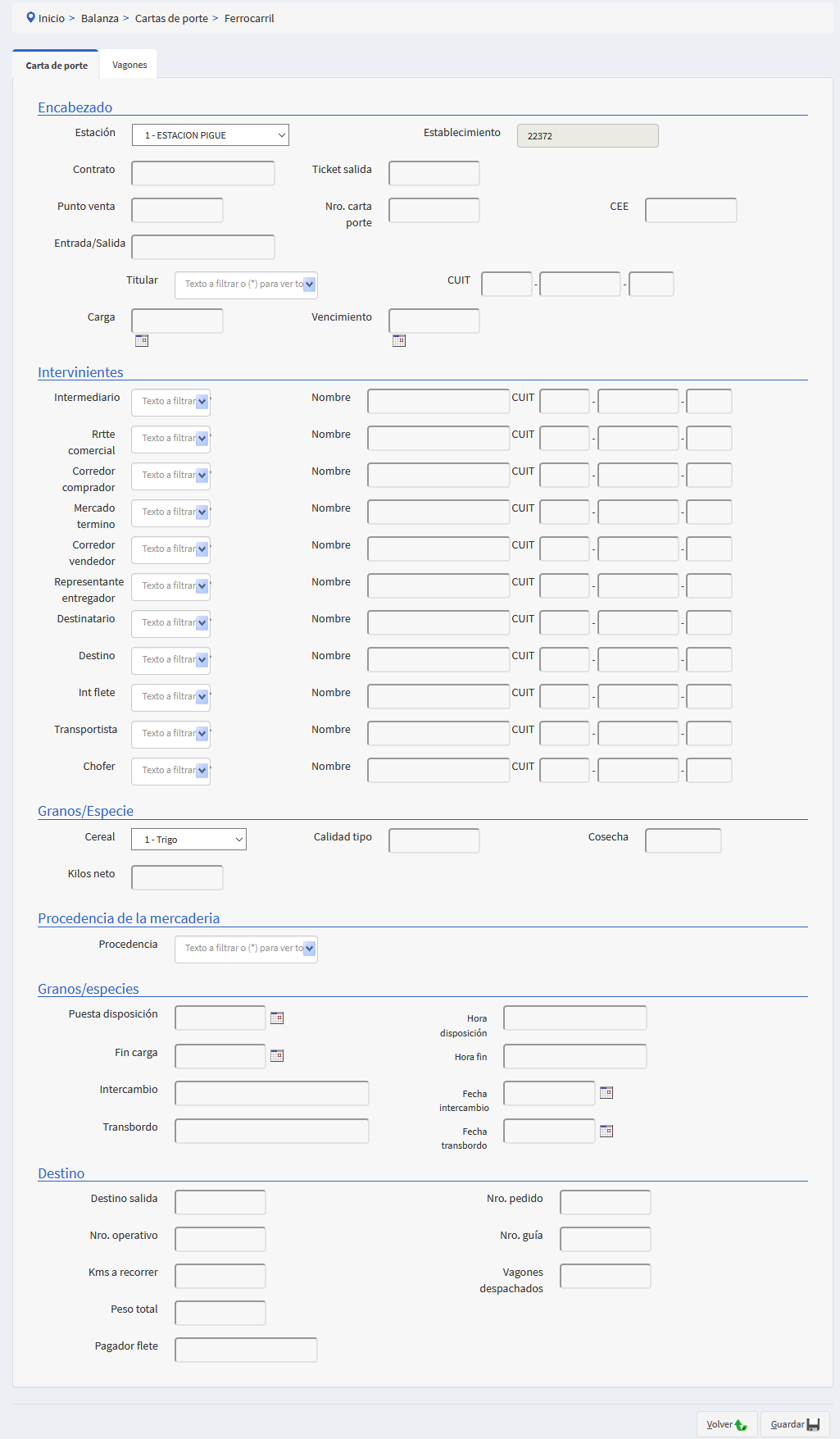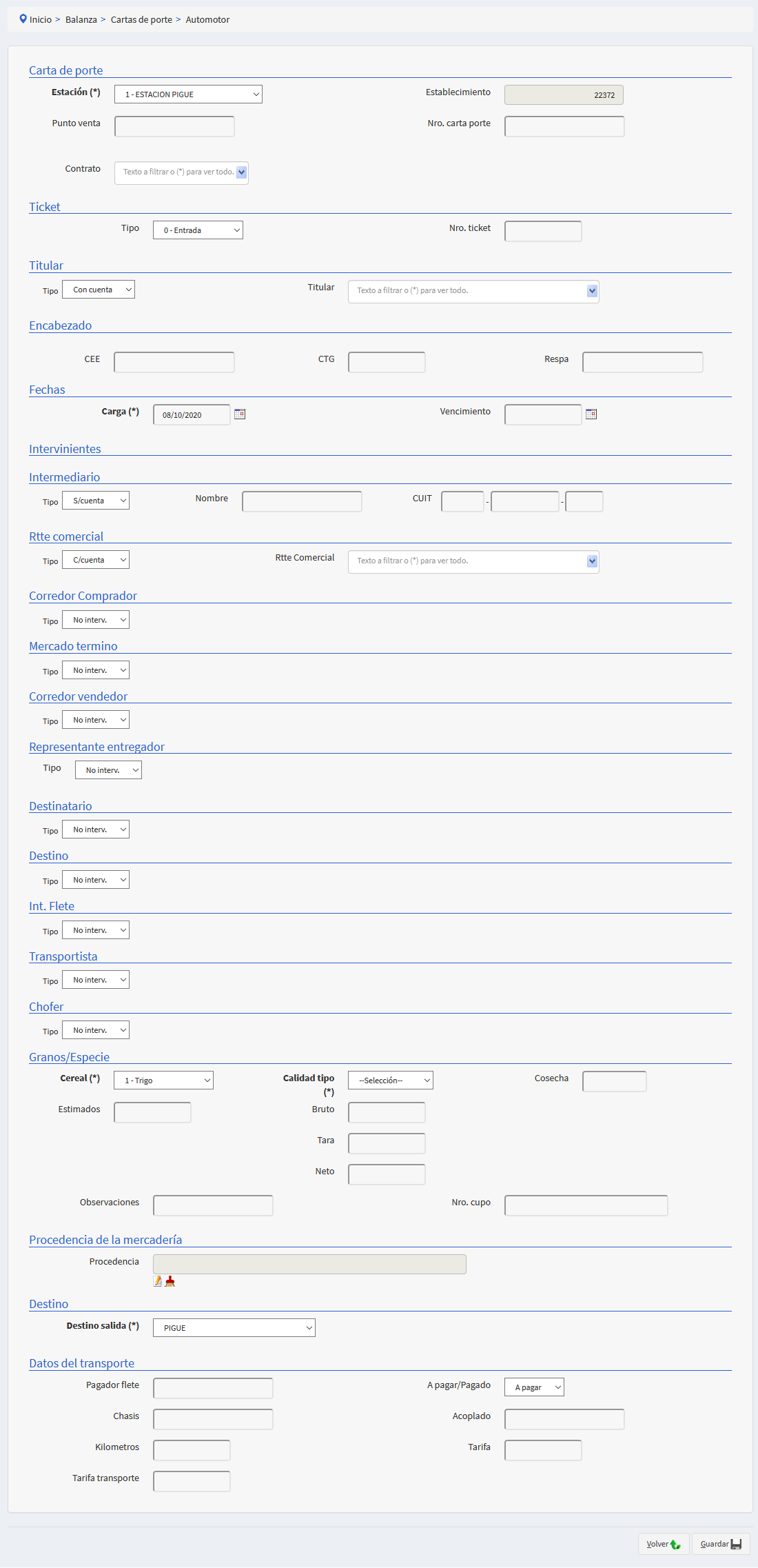- Planta, número de carta de porte, punto de venta, el cereal y el tipo de carta de porte, en caso de seleccionar de transferencia se deberá especificar si la misma es de entrada o salida. (Ver)