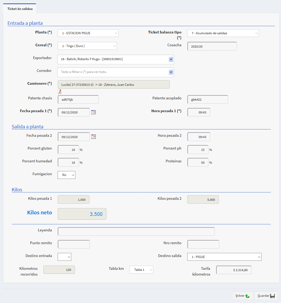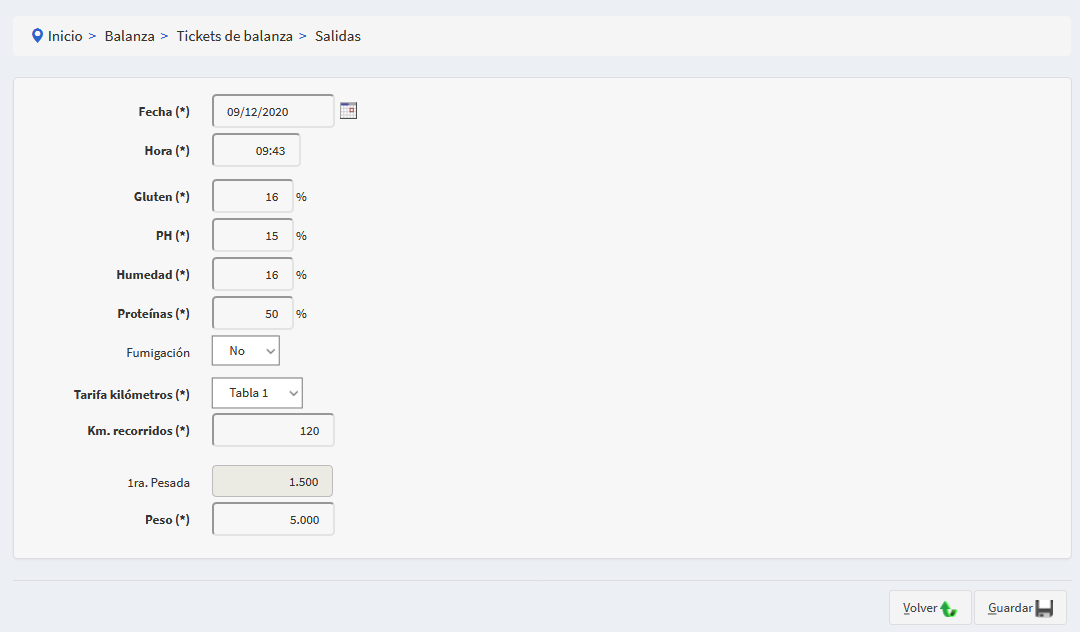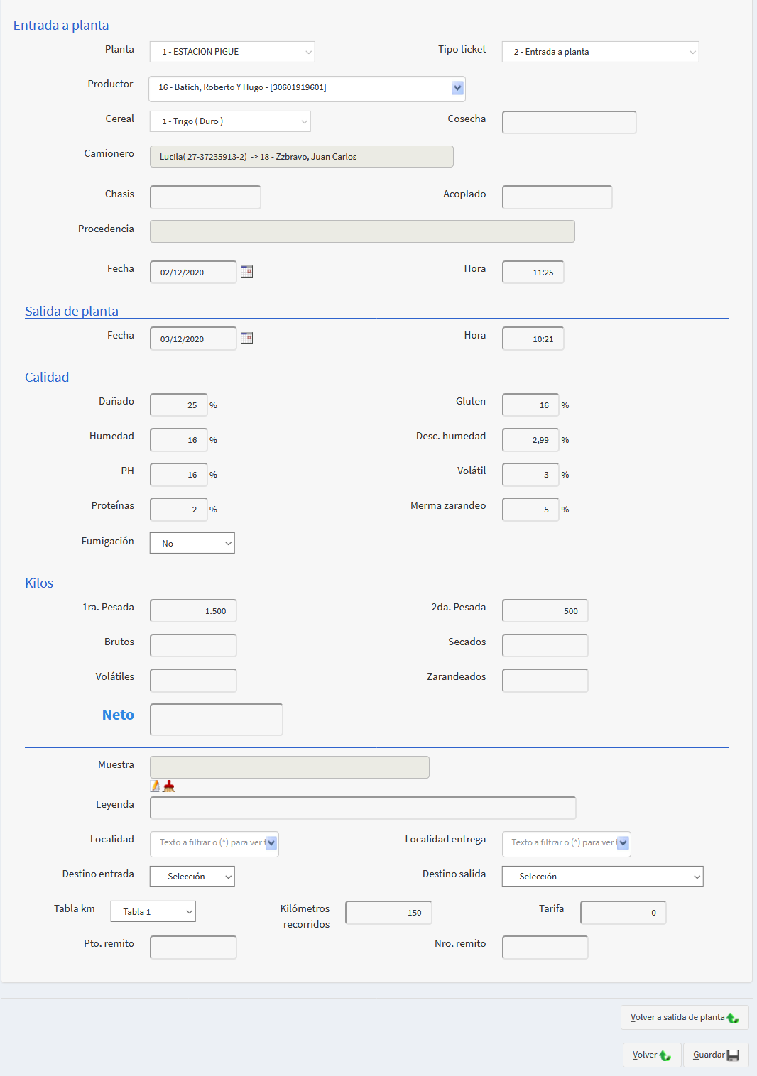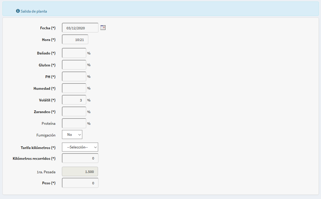 - La fecha y hora de la pesada, y los porcentajes de calidad como: dañado,gluten, ph, humedad, volatil, zarandeo, proteina. Si se fumigó o no. E ingresar por último los kilos de la segunda pesada. Es decir los kilos del camiòn una vez descargado.