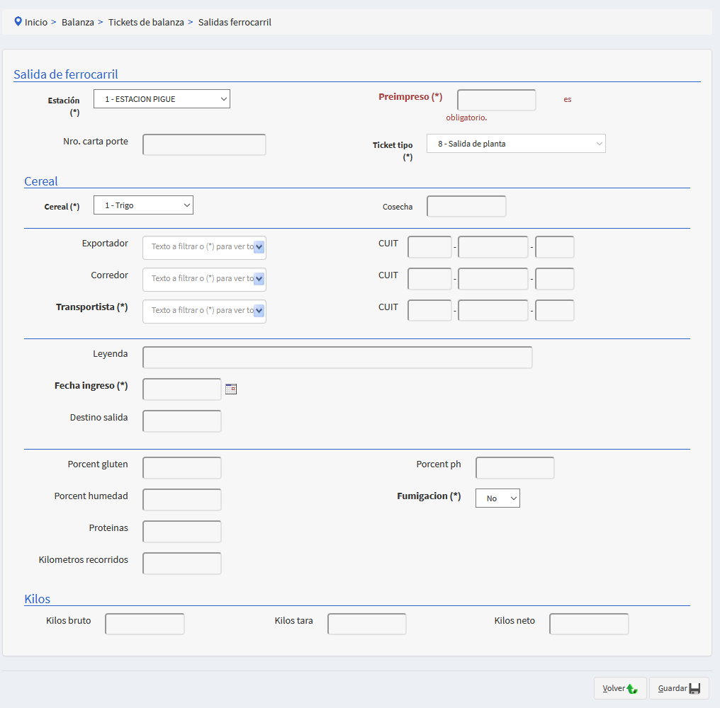 Ticket preimpreso, estación, tipo de ticket, cereal, transportista, fecha de ingreso y fumigación. Caso contrario no se dejará guardar.