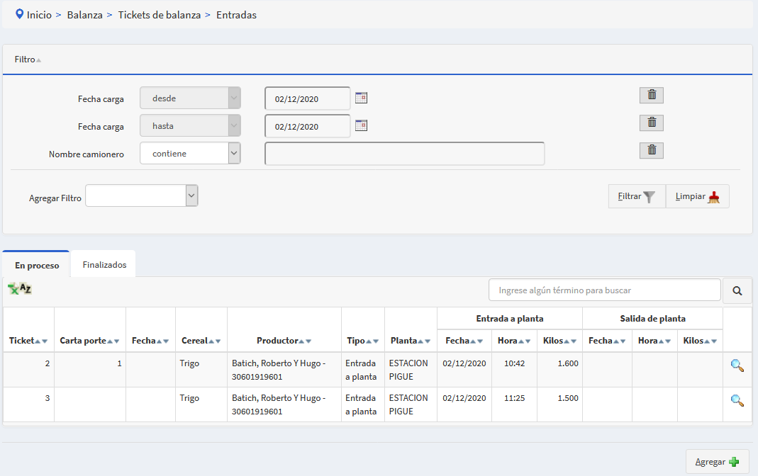 Se provee un sistema para editar tickets de balanza, dando distintas opciones para buscarlos y también para generar nuevos tickets. Al ingresar al apartado tickets de balanza de entrada, visualizará un cuadro con tickets en proceso y tickets finalizados, además de un filtro para buscarlos. Se considera tickets en proceso, a los tickets que estan en proceso de ser descargados, es decir entraron a la planta pero todavía no descargaron el camión. En cambio los finalizados, son los que ya descargaron e hicieron las correspondientes pesadas, con el camión lleno y el camión vacío.