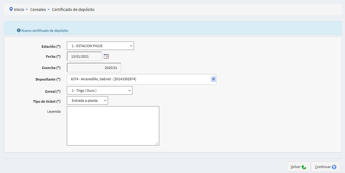 En el primer paso se deberá cargar la planta, cosecha, depositante, cereal, tipo de ticket y fecha.