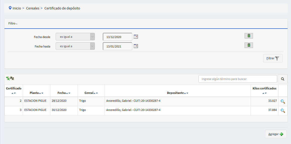 Cereales/certificados deposito
